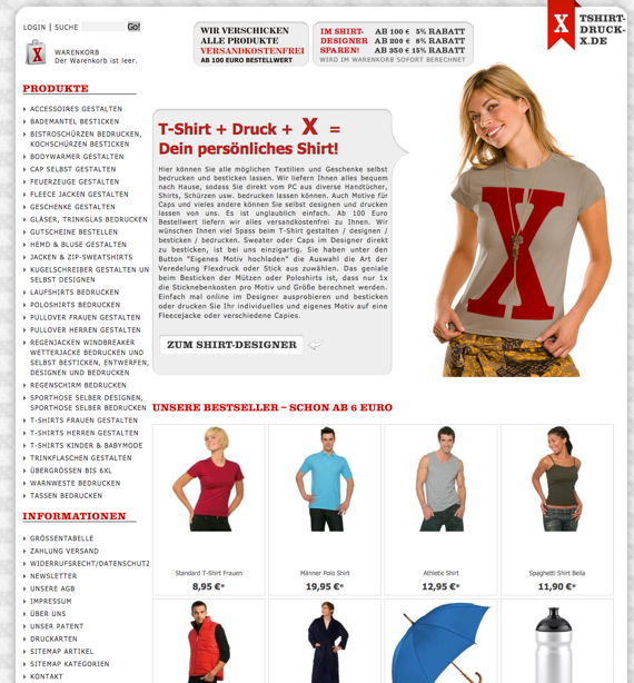 Tshirt-Druck-X bietet Ihnen zahlreiche Schnäppchen und ein riesiges Angebot an Möglichkeiten, wenn es um einen seriösen Textil-Druck geht. Sparen Sie durch den minimalen Bestellwert genauso wie die zahlreichen Bestandskunden und nutzen Sie die eine oder andere Online Aktion für nur wenige Euro, wenn Sie den Auftrag vergeben. Sie können hier nicht nur T-Shirts bedrucken lassen, sondern nebenbei finden Sie auch ein Schnäppchen bei den