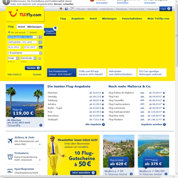 Wenn Sie öfter auf Reisen sind oder Ihren nächsten Urlaub planen, sollten Sie auf jeden Fall die Seite von TUIfly.com besuchen, denn hier erwarten Sie viele attraktive Angebote, mit denen Sie Zeit und Geld sparen können und trotzdem keine Abstriche bei der Qualität machen müssen. Finden Sie genau den Flug, der Ihren Bedürfnissen entspricht und geben Sie in die Suchmaske Ihre Suchkriterien ein, um noch schneller an ein Ergebnis zu kommen. Nicht umsonst ist dieser Anbieter derartig billig, doch am besten überzeugen Sie sich selbst von der hohen Qualität dieses Portals und werden schnell fündig, wenn es in Ihre Reisewünsche geht. Gerne können Sie sich auch für eine Pauschalreise entscheiden, denn in diesem Bereich finden Sie viele Pakete, die Ihren Wünschen bestimmt entsprechen. Entdecken Sie die riesige Welt der vielfältigen Möglichkeiten, die Ihnen hier geboten wird, wenn es um Ihren Urlaub geht. Surfen Sie bequem online durch das Netz und treffen Sie Ihre Wahl!
