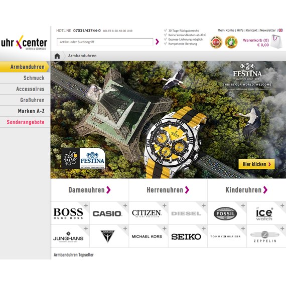 Sichern Sie sich die zahlreichen Kundenvorteile, wenn Sie bei Uhrcenter einkaufen, und genießen Sie das riesige Online Angebot, das Ihnen hier offeriert wird. Sobald Sie eine Bestellung von nur 40 Euro gültig machen, können Sie sich sogar über eine kostenlose Lieferung freuen, also worauf warten Sie noch? Abonnieren Sie noch den kostenlosen Newsletter, damit stets auf dem Laufenden bleiben, und nutzen Sie den Geschenkservice sowie den Armbandservice, denn es lohnt sich auf alle Fälle! Gerne können Sie Ihre gewünschte Zahlungsart aus mehreren Varianten wählen und vergessen Sie nicht, noch kurz auf unserem Portal für Ihre exklusiven Uhrcenter Gutscheine vorbeizuschauen, denn damit sparen Sie so richtig Geld!