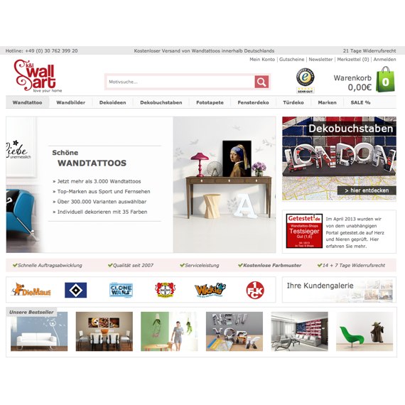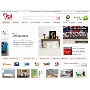 Genießen Sie das umfassende Angebot auf der Seite von Wall Art und machen Sie Ihren Bestellwert heute noch gültig, denn hier können Sie den einen oder anderen Euro sparen. Haben Sie schon gesehen, dass Ihnen hier mehr als 5000 unterschiedliche Dekorationsartikel zur Verfügung gestellt werden? Machen Sie vom dreiwöchigen Widerrufsrecht Gebrauch, denn Sie gehen hier kein Risiko ein, und kaufen Sie auf Rechnung, wenn Sie es wünschen. Nach Deutschland und Österreich werden sämtliche Wandtattoos portofrei geliefert, ohne dass Sie einen vorgegebenen Mindestbestellwert erreichen müssen! Gerne können Sie sich auf unserem Portal noch Ihre exklusiven und persönlichen Wall Art Gutscheine besorgen!