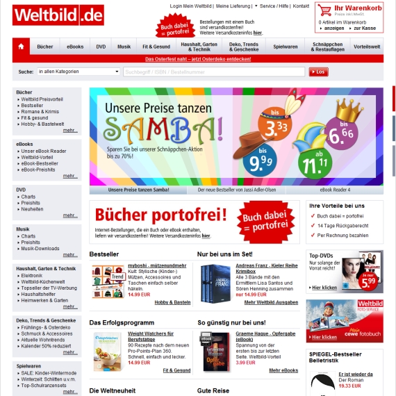 Wenn Ihnen ein E-Book besser gefällt als das typische klassische Buch, werden Sie auch in dieser Hinsicht von Weltbild und dem riesigen Angebot begeistert sein. Laden Sie sich alles auf Ihren Rechner, wofür Sie sich interessieren, denn hier setzt man Ihnen keine Grenzen. Gerne können Sie auch in der Abteilung schmökern oder sich bei den DVDs und Bluray Discs umsehen. Finden Sie alle Richtungen und Genres, die der Markt zu bieten hat und sehen Sie sich bei den Angeboten für Volksmusik, Schlager, Hiphop, Rock ‚n‘ Roll und noch vielen weiteren um. Dazu müssen Sie nicht einmal Ihre eigenen vier Wände verlassen, denn Sie können sich ganz bequem alles nach Haus liefern lassen, bzw. sich die Produkte auf den Rechner laden.