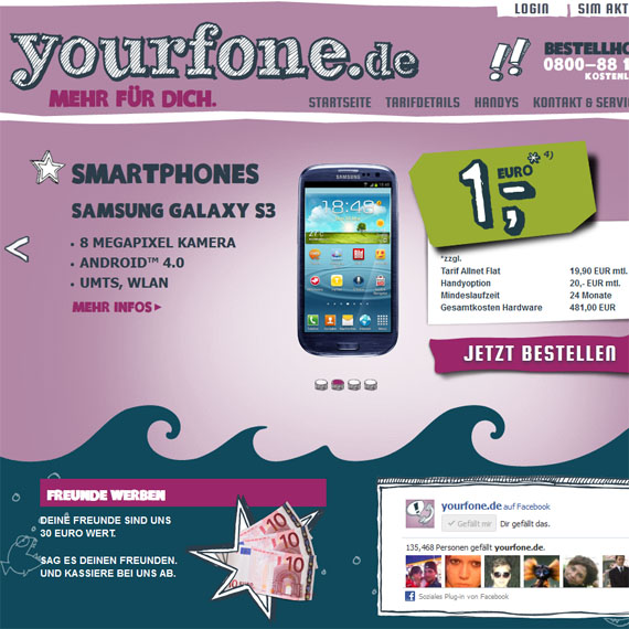 Mit Yourfone müssen Sie nie wieder ein schlechtes Gewissen haben, wenn Sie mit Ihrem Handy oder Ihrem Smartphone telefonieren, im Internet surfen oder SMS schreiben, denn hier wird Ihr Geldbeutel geschont und auf Ihr Budget geachtet. Mit diesem Anbieter sind Sie niemals zu teuer unterwegs, doch am besten überzeugen Sie sich selbst auf der Webseite.