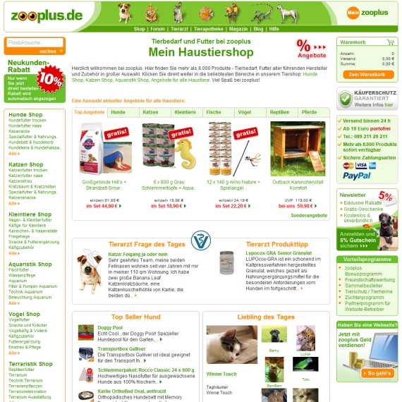 Der Onlineshop von zooplus ist sehr übersichtlich gestaltet, also nehmen Sie sich Zeit und durchstöbern Sie alle Angebote. Wenn Sie auf der Suche nach einer ganz speziellen Sache sind, finden Sie diese mit nur wenigen Mausklicks. Begeben Sie sich in die unterschiedlichen Extrashops für den entsprechenden Tierbereich, angefangen bei Terraristik, bis hin zu Vögeln, Aquaristik, Kleintiere, Katzen und Hunde, sowie Pferde. Es spielt keine Rolle, um welches Tierart es sich handelt, denn hier werden Sie bestimmt das richtige Futter oder Zubehör finden. Das Sortiment ist derartig breit gefächert, dass es länger dauert, um alle Angebote anzusehen. Sie benötigen einen Vogelkäfig oder ein Aquarium? Kein Problem, bestellen Sie gleich hier! Sie wollen Ihr Terrarium neu einrichten und sind auf der Suche nach der passenden Dekoration oder brauchen eine Reithose? Füllen Sie Ihren Warenkorb gleich hier und sparen Sie bares Geld. So fühlt sich Ihr Tier rundherum wohl und Sie haben noch mehr Freude damit. Wenn Sie zu den echten Tierfreunden gehören, schlägt Ihr Herz mit Sicherheit augenblicklich höher, sobald Sie den Onlineshop von Zooplus betreten.
