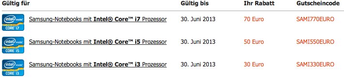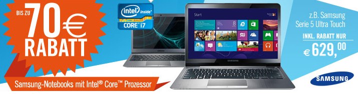 Im Online-Shop von Cyberport gibt es derzeit eine sehr attraktive Aktion, die besonders für Kunden interessant ist, die sich gerade ein neues Notebook anschaffen wollen. Sämtliche Laptops des südkoreanischen Herstellers können bis einschließlich dem 30. Juni 2013 in Kombination mit einem exklusiven Cyberport Gutschein zu einem stark reduzierten Preis angeschafft werden. Dabei müssen Sie nur darauf achten, dass das Samsung Notebook mit einem Intel Core Prozessor ausgestattet ist. Je hochwertiger der Chip, desto höher fällt auch die erwartete Reduzierung für Sie aus!