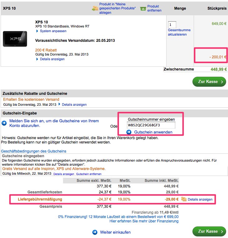 Besuchen Sie zunächst die Angebotsseite direkt auf der Homepage von DELL und entscheiden Sie sich für eines der drei zur Verfügung stehenden Modelle der Produktreihe. Klicken Sie auf den Button „Konfigurieren & Kaufen“ und folgen Sie dem Bestellprozess. Sie haben auch die Möglichkeit, spezielles Zubehör zu kaufen. Klicken Sie sich bis zur Kasse und geben Sie im Feld der Rabattcodes den DELL Gutschein WB52QC29G68GF3 ein. Damit entfallen die Versandkosten und Sie sparen insgesamt 29 Euro ein. Werfen Sie zudem einen Blick auf den nachfolgenden Screenshot. So wissen Sie sofort, wo Sie den Gutschein einlösen müssen.
