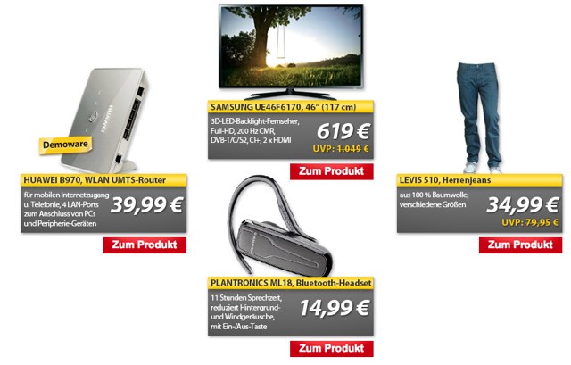 Neben den Jeans von LEVIS stehen auch noch drei weitere Sonderaktionen zur Verfügung. Unter anderem dreht es sich dabei um einen WLAN UMTS-Router der Marke Huawei sowie um ein Bluetooth-Headset von Plantronics und einen Samsung 3D LED-Backlight-TV. Schauen Sie hierzu am besten einmal in das aktuelle Angebot von MeinPaket. Geben Sie aber unbedingt einen der MeinPaket Gutscheine an und holen Sie sich zusätzliche Rabatte!
