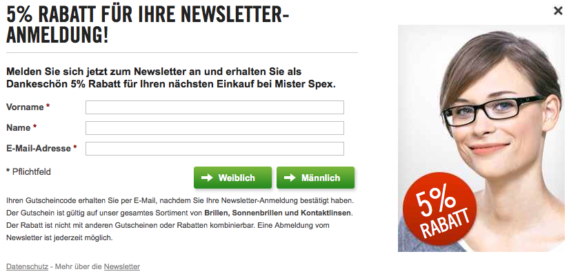 Im Online Shop von Mister Spex haben Sie zudem die Möglichkeit zur kostenlosen Anmeldung beim Newsletter. Somit werden Sie stets auf dem aktuellsten Stand gehalten, wenn neue Kollektionen der populären Markenhersteller verfügbar sind. Als kleines Dankeschön erhalten Sie einen attraktiven Gutscheincode, der Ihnen einen Rabatt in Höhe von 5 Prozent verspricht. Diesen Rabattcode können Sie ganz einfach in der Bestellabfolge einlösen und die zu zahlende Bestellsumme reduzieren. Wir bieten Ihnen natürlich auch weitere Mister Spex Gutscheine an, die Sie kostenlos bei uns abrufen können. Geben Sie diese Rabattcodes an und sichern Sie sich Ihre Brillen & Kontaktlinsen zum absoluten Bestpreis!