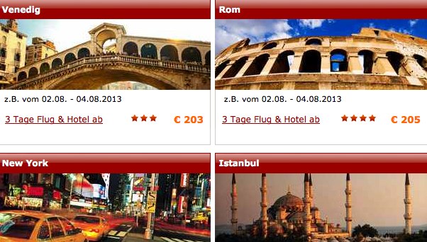 Sehr interessant sind auch die Kombinationsangebote der Städtereise, die Sie auf der Homepage von Opodo entdecken können. Suchen Sie Ihren Flug und Ihr Hotel flexibel aus und stellen Sie Ihre Reise genau so zusammen, wie Sie es sich vorstellen. Fliegen Sie günstiger mit dem KombiJetting, wenn Sie beispielsweise mit einem Billigflieger den Hinflug buchen und für den Rückflug einen klassischen komfortablen Linienflug auswählen. Sie profitieren bei diesen exklusiven Angeboten aus dem Online Shop von Opodo von einer Rundum-Sicherheit wie bei Pauschalreisen und frei wählbaren Flugzeiten sowie einem intuitiven Online-Check-In. Probieren Sie es doch ruhig einmal aus und vergleichen Sie die Preise mit den Angeboten von Expedia.