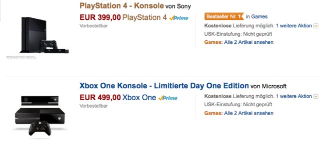 Als Spiele-Fans werden Sie sich ganz bestimmt bereits ausgiebig zu den neuen Spielekonsolen von Sony und Microsoft informiert haben. Beide Hersteller und Platzhirsche der Branche enthüllten nun erstmals sämtliche notwendigen Details zu den neuen Konsolen, wobei zudem der Preis bekannt gegeben wurde. Sonys PlayStation 4 wird in Deutschland 399 Euro kosten, während die Xbox One von Microsoft mit 499 Euro zu Buche schlagen wird. Genaue Termine zum Marktstart wurden noch nicht veröffentlicht. Dennoch bietet der Online-Händler Amazon beide Geräte bereits als Ware für Vorbesteller an und garantiert in diesem Zusammenhang den Bestpreis zur Veröffentlichung.